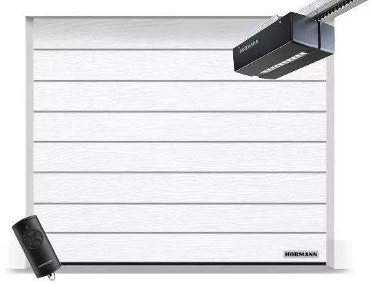 Hörmann 2500x2250, RAL9016, Woodgrain, M bordás, Promatic 4 motor, FS10 M közepes sínnel
